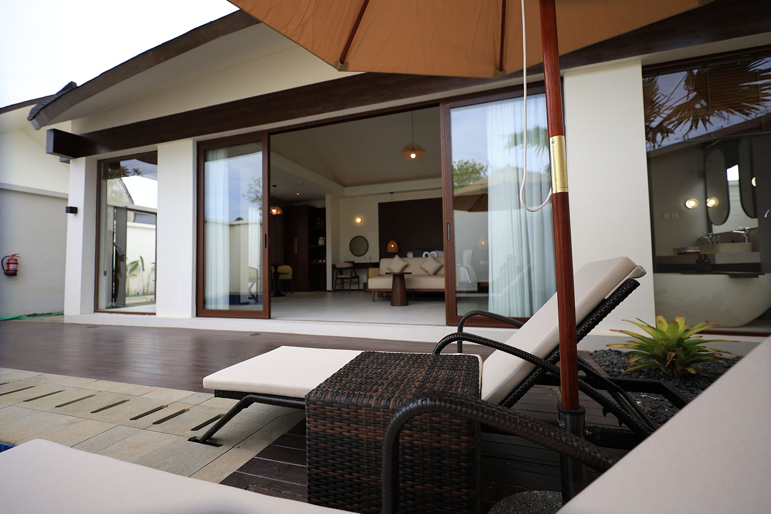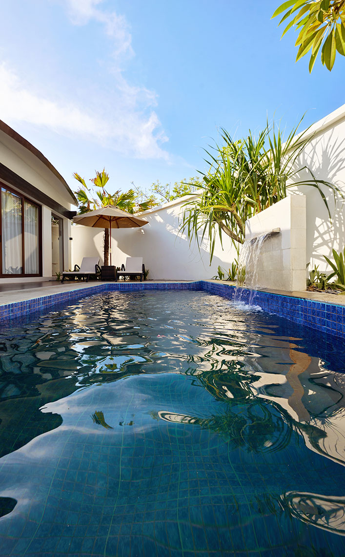 Deluxe Suite with a total plot area of 150 m² and a built-up area of 60 m², featuring one bedroom, living room, bathroom, and a private pool.